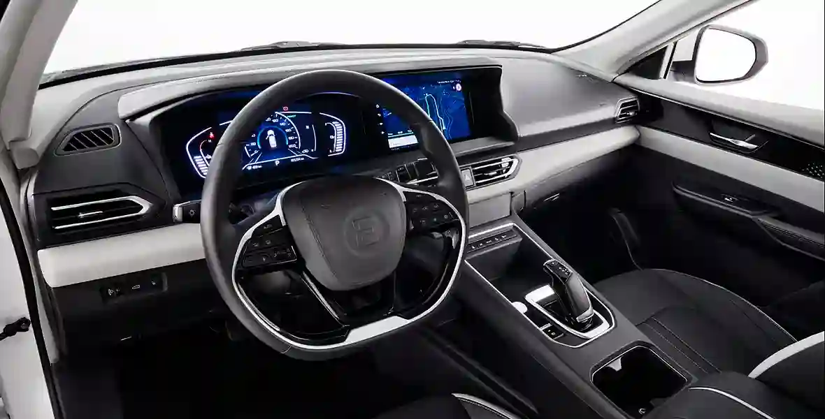 Дизайн EVOLUTE i‑PRO не назовешь ультрасовременным. Его кузовные линии, особенно если смотреть в профиль, напоминают о близких «родственниках» — Dongfeng Aeolus E70, Nissan Sylphy и Nissan Almera третьего поколения. Причем последний, как известно, выпускали на АВТОВАЗе с 2012 по 2018 год. Однако все кузовные панели i‑PRO оригинальные, а фронтальная часть радикально переоформлена. Здесь появились светодиодные ДХО, галогеновая оптика современного кроя и крупный лючок зарядки с комбинированным коннектором, позволяющим пользоваться как медленной зарядкой Type 2 (с переменным током), так и быстрой CCS2 (с постоянным током). Природолюбивую сущность липчанина выдают также глухая фальшрадиаторная решетка и «аэродинамические» колесные диски со спицами, прикрывающими дисковые тормозные механизмы.