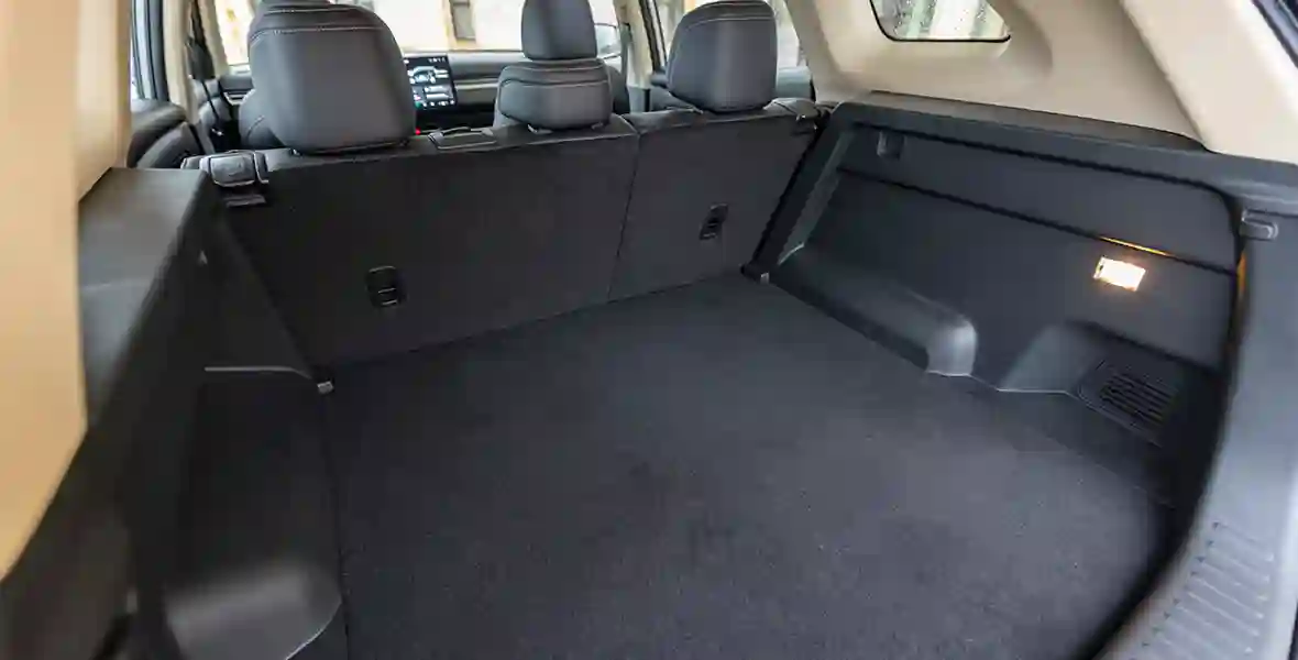 Багажник i‑SPACE остаётся одним из самых вместительных в классе среднеразмерных кроссоверов. В пятиместной конфигурации объём грузового отсека составляет 934 литра, а при сложенных втором и третьем рядах увеличивается до 2 125 литров. Сеточек для фиксации и багажной шторки, несмотря на имеющиеся в 5-местной версии характерные пазы и направляющие, мы не обнаружили. Зато под полом разглядели удобный органайзер с двумя вместительными ёмкостями. А вот запасного колеса и даже докатки как не было, так и нет. Только набор для ремонта проколов.